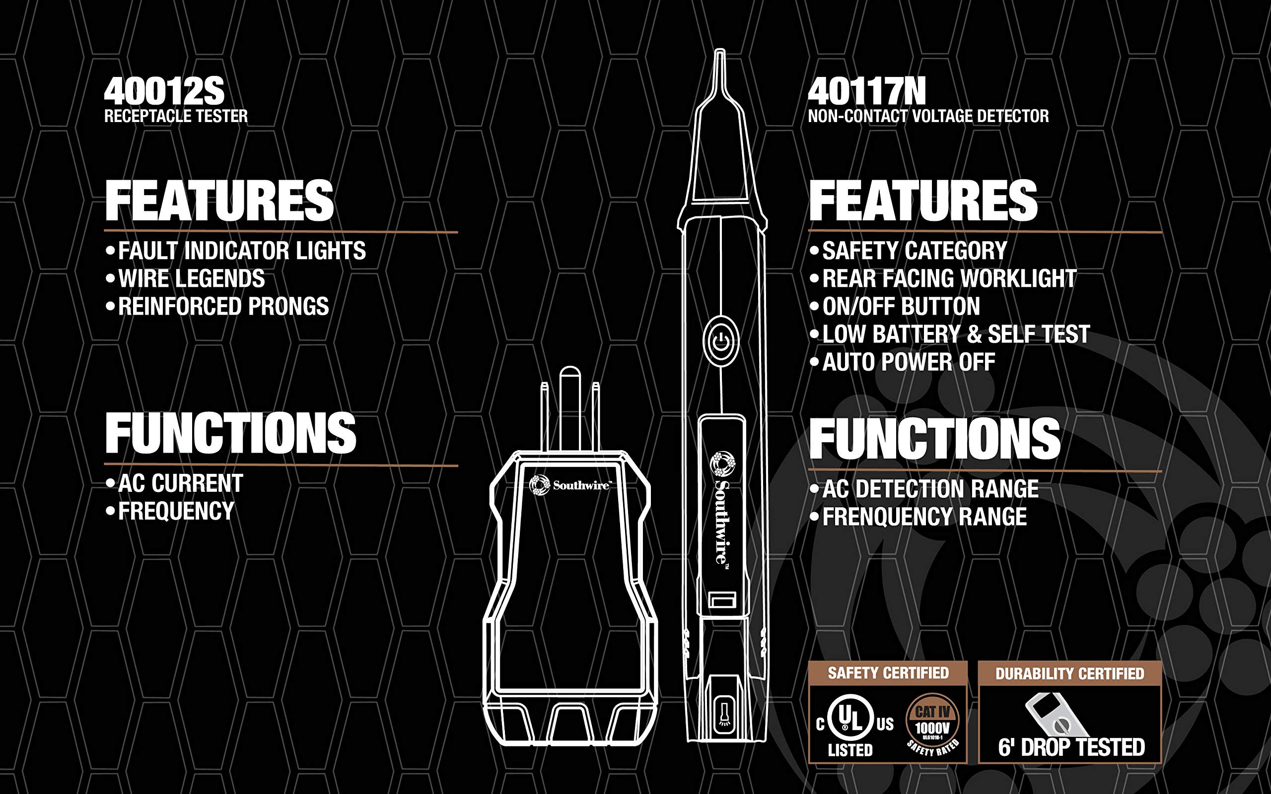 - Essential 3-in-1 Testing Kit: This Southwire Kit combines a receptacle tester with a safety rated multimeter and non-contact voltage detector making it ideal for home inspectors and electricians