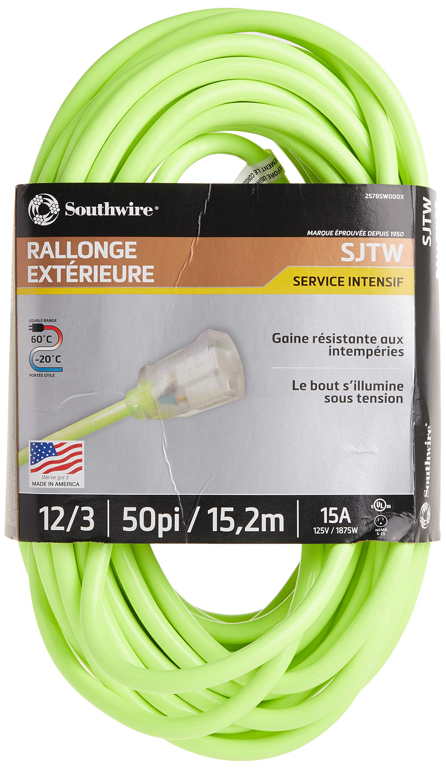 Southwire Heavy Duty Extension Cord, 50Ft, 12 Gauge, 3 Conductor, High Visibility Outdoor Cord, Lighted End, SJTW, Cool Green, 2578SW000X